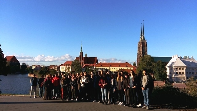 Wczesnym rankiem 9 października klasy II i III gimnazjum wyruszyły na długo wyczekiwaną wycieczkę szkolną. Zarówno pogoda jak i humory dopisywały wszystkim uczestnikom, gdy dotarliśmy do pierwszego punktu harmonogramu – zamku w Mosznej – jednego z najpiękniejszych zamków w Polsce. Po zwiedzaniu ogrodów i zabytkowych wnętrz pałacu ruszyliśmy w dalszą drogę. Jednak korki i utrudnienia na trasie spowodowały, że nasza podróż do celu wydłużyła się dwukrotnie. Po dotarciu do Wrocławia udaliśmy się do Ogrodu Japońskiego, który stał się wrocławską namiastką kultury Kraju Kwitnącej Wiśni, gdzie podziwialiśmy wyjątkowo malownicze o tej porze roku zakątki i roślinność charakterystyczną dla Azji. Potem uczestniczyliśmy w przepięknym pokazie multimedialnym fontann przy Hali Stulecia. Po obejrzeniu najbardziej rozpoznawalnych miejsc Wrocławia udaliśmy się na spotkanie z panią przewodnik. Dalsze zwiedzanie z przewodniczką rozpoczęliśmy karkołomnym wyjściem na wysokość 45 m, gdzie znajduje się Most Pokutnic czyli kładka łącząca obie wieże kościoła św. Magdaleny. Potem udaliśmy się na popołudniowo-wieczorny spacer na Starówkę Wrocławia, w czasie którego oprócz podziwiania zabytkowej architektury szukaliśmy bardziej współczesnych krasnali, z których słynie Wrocław. Zmęczeni pełnym atrakcji dniem dotarliśmy do Hotelu Wena, gdzie czekała na nas już ciepła obiadokolacja. Po zakwaterowaniu i krótkim odpoczynku wystarczyło nam sił na integrację międzyklasową. Drugi dzień rozpoczęliśmy od wizyty w ZOO i Afrykarium. Zafascynowani byliśmy podziwianiem różnorodności fauny i flory z różnych kontynentów. Największą atrakcją było oceanarium, gdzie znajduje się 15 mln litrów wody w 21 basenach i akwariach, przedstawiające różne ekosystemy ze środowiskiem wodnym. Potem udaliśmy się na Ostrów Tumski - najstarszą a zarazem najpiękniejszą część miasta, gdzie pani przewodnik opowiadała nam ciekawe historie na temat miasta i legend z nim związanych. Ostatnim punktem programu była Panorama Racławicka, gdzie obejrzeliśmy jeden z najsłynniejszych w Polsce obrazów. Następnie zmęczeni ale zadowoleni i pełni wrażeń wróciliśmy do domów.