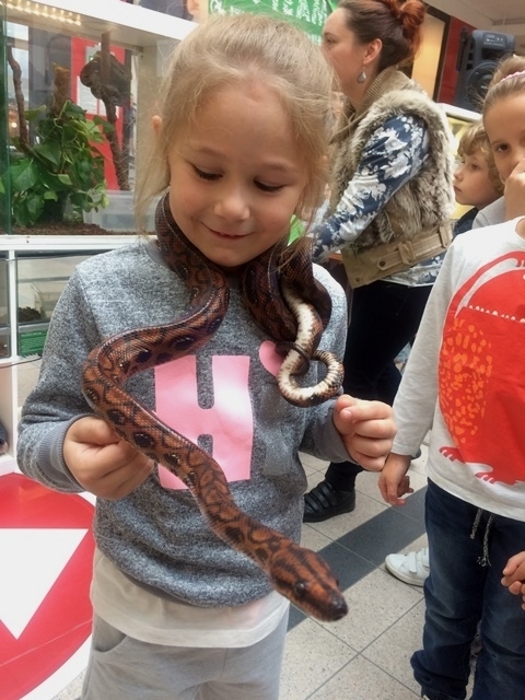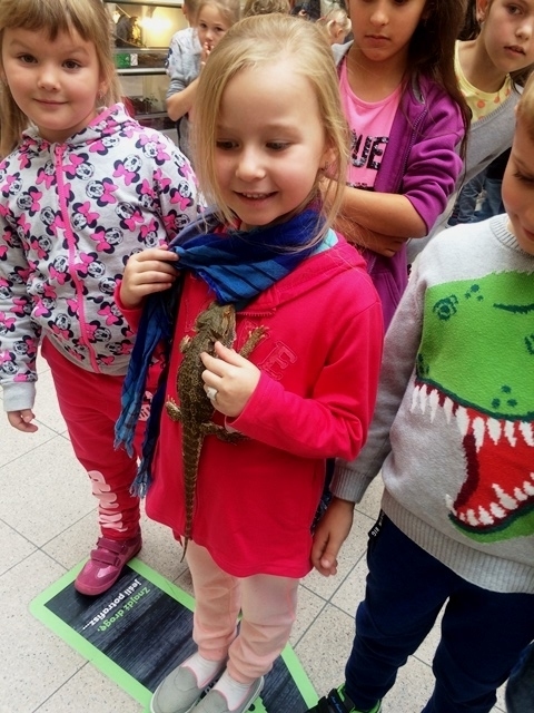 Na miejscu uczniów przywitał pan, który przeprowadził prelekcję, przekazał ciekawostki z życia zwierząt obecnych na wystawie. Każdy uczestnik spotkania mógł zrobić sobie pamiątkowe zdjęcie z wyjątkowymi okazami. Dzieci były pod ogromnym wrażeniem mając bezpośredni kontakt z wężami, jaszczurkami, pająkami czy jeżem pigmejskim. Wykazały niezwykłą odwagę pozując z wężem na szyi czy kładąc na dłoni okazałego pająka ptasznika. Po zakończonej prelekcji wyjechały ruchomymi schodami i kulturalnie przy stolikach zjadły posiłek.