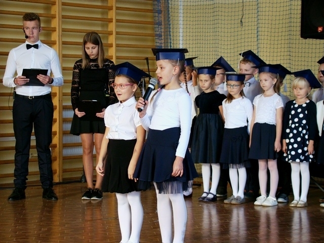 12 października odbyła się w naszej szkole uroczystość pasowania na ucznia dzieci z klasy pierwszej. Święto rozpoczęło się mszą świętą. Następnie wszyscy uczniowie wraz z wychowawcami przeszli do szkoły na akademię łączącą ślubowanie klasy pierwszej i tradycyjny Dzień Nauczyciela. W galowych strojach, przy pięknej dekoracji przygotowanej przez p. D. Pawlik uczniowie zaprezentowali swój program artystyczny. Rozpoczęli odtańczeniem „Poloneza”, następnie zadeklamowali wiersze i zaśpiewali piosenki o szkole, przyjaźni oraz Ojczyźnie.