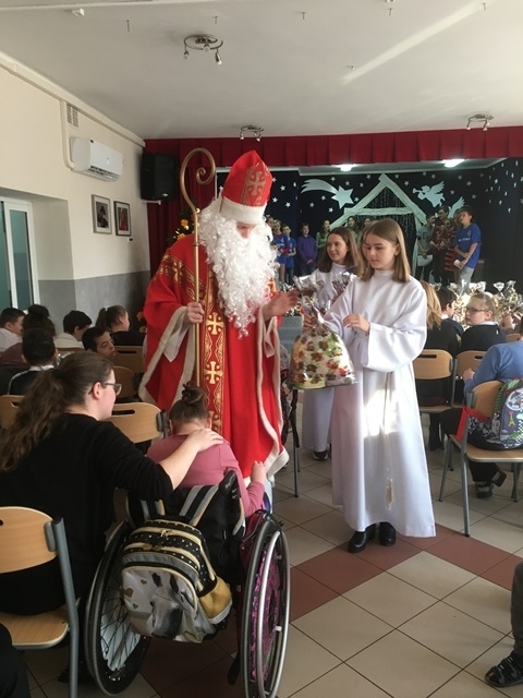 16 grudnia 2019 r. dwudziestu Wolontariuszy z naszej szkoły wraz z opiekunem p. Magdaleną Cieślewicz udało się do Specjalnego Ośrodka Szkolno-Wychowawczego do Nowego Sącza, by zrobić mikołajową niespodziankę niepełnosprawnym dzieciom. Przedstawili podopiecznym SOSW spektakl słowno-muzyczny, a następnie Święty Mikołaj, którym był Wolontariusz Paweł z 8a, rozdał uczestnikom przedstawienia prezenty. Na koniec wszyscy chętni robili sobie zdjęcia z Mikołajem. Potem całą grupą udaliśmy się do zespołów rewalidacyjno-wychowawczych, gdzie przebywają dzieci głęboko upośledzone. Śpiewaliśmy dla nich piosenki, a Mikołaj wraz z aniołami rozdał resztę prezentów. Po obejrzeniu tej placówki pojechaliśmy do podopiecznych Niepublicznego Ośrodka Rewalidacyjno-Wychowawczego „Gromadka”.