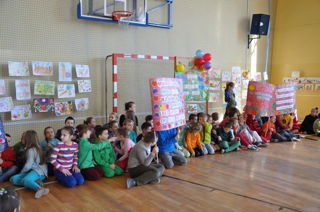 W pierwszy dzień wiosny dzieci z klas 0-III spotkały się na sali gimnastycznej, by pod hasłem „Warzywa i owoce mają głos” promować zdrowy styl życia.