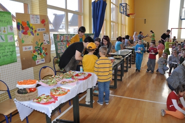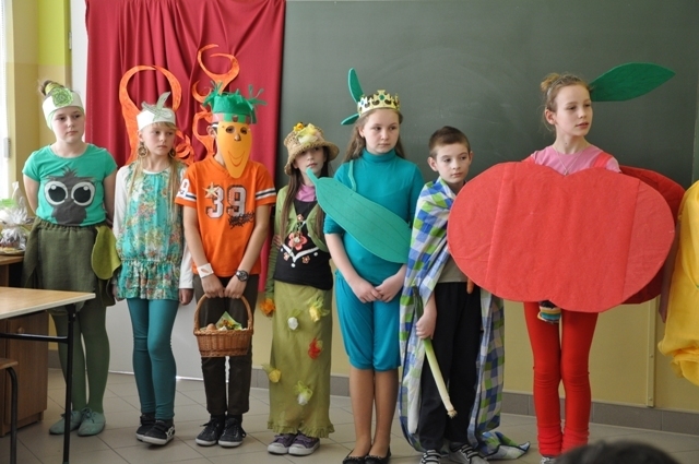 Barwnie i pomysłowo przebrani uczniowie wcielili się w postacie warzyw i owoców. Każda klasa wykonała kolorowe transparenty z hasłami dotyczącymi zdrowego odżywiania. Było wesoło i radośnie. Rodzice przygotowali wspaniałe kanapki, soki i zdrowe przekąski, które wszyscy zajadali z apetytem.