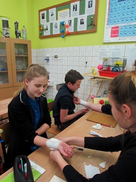 Lekcja biologii to dobra okazja, aby pomyśleć o naszym sercu i zdrowiu. Klasa 2 b gimnazjum właśnie się o tym przekonała wraz z nauczycielem biologii panią Karoliną Botwiną. Sala lekcyjna zamieniła się w prawdziwy punkt medyczny. Uczniowie mierzyli sobie nawzajem ciśnienie, plus na tętnicy szyjnej co okazało się nie taką prostą sprawą. Czasami wyglądało to dość ciekawie, a nawet zabawnie. Uczniowie poznali budowę serca, na modelu mogli samodzielnie ułożyć wszystkie narządy wewnętrzne a także nauczyli się tamować krwotoki udzielając pierwszej pomocy przedmedycznej. Taka forma lekcji i pracy pozwoliła każdemu przekonać się jak ważna jest znajomości ludzkiego organizmu i jego prawidłowego funkcjonowania. Umiejętności, które uczniowie nabyli z pewnością będą cenne i zapamiętane na bardzo długo.