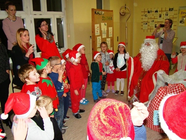 5 grudnia dla wszystkich naszych przedszkolaków był specjalnym dniem, ponieważ każde z dzieci marzyło o tym, aby spotkać wyjątkową postać - Świętego Mikołaja. Nie było to jednak zwykłe spotkanie, ponieważ nasz święty postanowił się przed nami sprytnie schować. W ramach ułatwienia zostawił swoim elfom pomocnicze wskazówki, które miały nam pomóc w odnalezieniu jego kryjówki. Aby je otrzymać musieliśmy najpierw wykonać różne zadania. Na początek, jako rozgrzewka - pięć przysiadów i pięć pajacyków. Następnie układaliśmy puzzle z wizerunkiem naszego gościa, śpiewaliśmy mikołajowe piosenki i odgadywaliśmy zapachy świątecznych aromatów. Emocje już sięgały zenitu, aż tu nagle, gdzieś w oddali usłyszeliśmy dźwięk mikołajowych dzwoneczków, prowadzący nas do szkolnego kącika regionalnego, który znajduje się na strychu naszej szkoły! Ochoczo podążaliśmy w kierunku Mikołaja, który nagle wyłonił się zza ściany. Jego lśniąca i długa broda nie pozostawiła nam żadnych wątpliwości, że to nasz kochany Święty Mikołaj. Uśmiechu i radości było bez liku! Wszystkie dzieci otrzymały upragnione prezenty, a w ramach podziękowań głośno zaśpiewały piosenki na cześć Mikołaja.