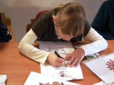 Druga część uczniów wzięła udział w warsztatach „Mała Akademia Folkloru- Etno-Inspiracje”. Uczestnicy zapoznali się z tradycją, obrzędowością, rzemiosłem artystycznym i sztuką ludową wybranych regionów Małopolski. Prowadząca przedstawiła uczniom tajniki powstawania tradycyjnych wzorów i motywów ludowych. W prezentacji multimedialnej i poprzez rekwizyty omówione zostały współczesne oblicza dizajnu inspirowanego folklorem. Uczestnicy dzięki zdobytej wiedzy etnograficznej i kulturowej, zgromadzonym materiałom i katalogom barw oraz wyobraźni twórczej stworzyli etno kolorowe projekty, które przenieśli na T-shirty, które zabrali ze sobą do domów.